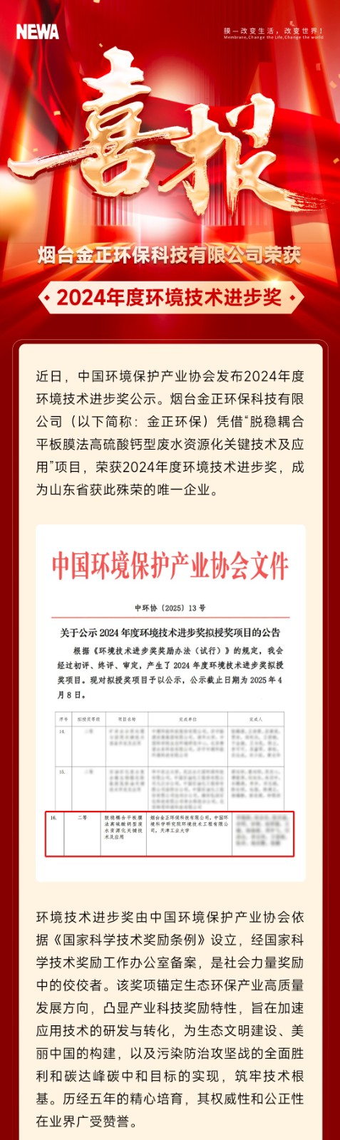 喜報|煙臺金正環(huán)保榮獲2024年度環(huán)境技術(shù)進(jìn)步獎